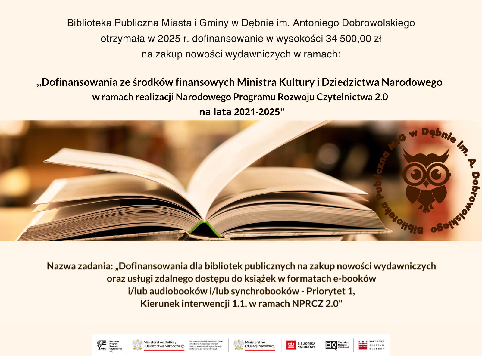 Biblioteka Publiczna Miasta i Gminy w Dębnie im. Antoniego Dobrowolskiego otrzymała w 2025 r. dofinansowanie w wysokości 34 500,00 zł na zakup nowości wydawniczych w ramach: