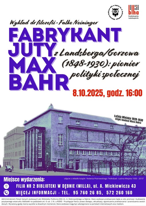 W środę, 8 października 2025 roku, mieszkańcy Dębna i okolic będą mieli okazję uczestniczyć w niezwykle interesującym wydarzeniu. O godzinie 16:00 w Filii nr 2 Biblioteki w Dębinie (Polsko- Niemieckie Transgraniczne Centrum Dziedzictwa Naturalnego i Kulturowego Regionu Doliny Środkowej Odry na ul. A. Mickiewicza 43) odbędzie się wykład dr filozofii Falko Neiningera pod tytułem „Fabrykant juty Max Bahr z Landsberga/Gorzowa (1848–1930): pionier polityki społecznej”.