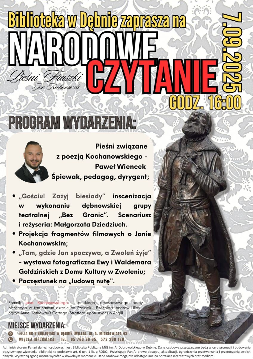 W niedzielę, 7 września, mieszkańcy Dębna i okolic będą mieli okazję uczestniczyć w wyjątkowym wydarzeniu. O godzinie 16:00 w Filii nr 2 Biblioteki (plac przy Polsko- Niemieckim Transgranicznym Centrum Dziedzictwa Naturalnego i Kulturowego Regionu Doliny Środkowej Odry na ul. A. Mickiewicza 43) rozpocznie się tegoroczna edycja Narodowego Czytania, poświęcona twórczości wybitnego polskiego poety renesansu, Jana Kochanowskiego.
