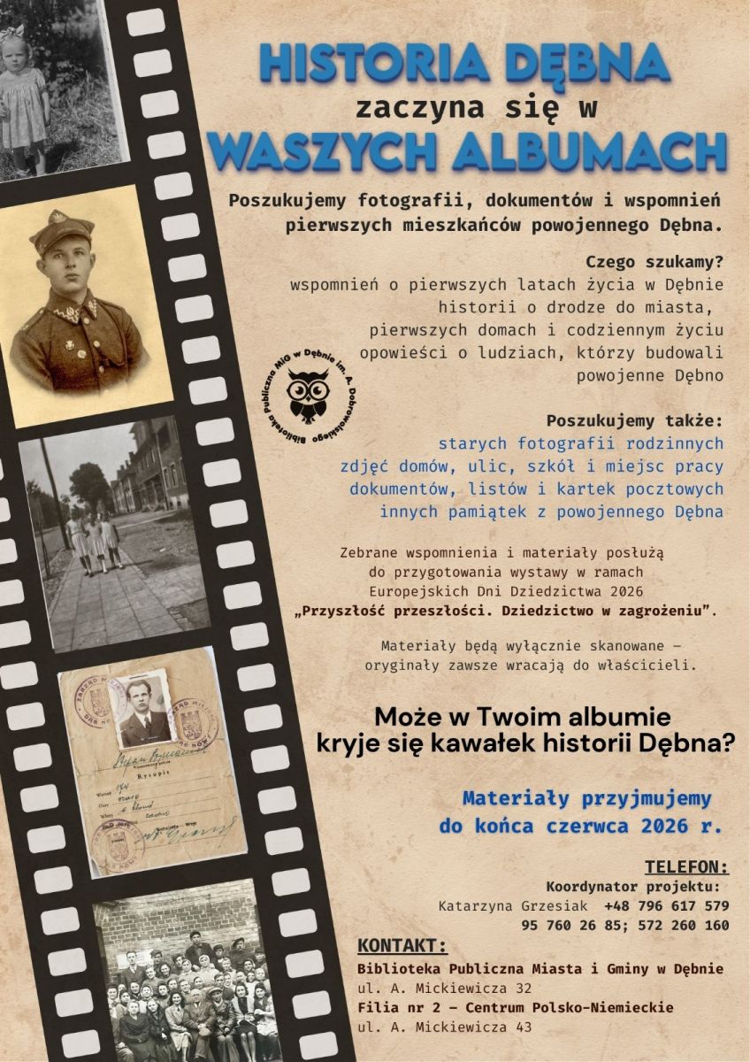 Tegoroczne hasło EDD – „Przyszłość przeszłości. Dziedzictwo w zagrożeniu” – przypomina, że pamięć o przeszłości może z czasem zniknąć, jeśli nie zostanie zachowana. Dlatego chcemy wspólnie ocalić historie o powojennych początkach Dębna – zapisane w ludzkiej pamięci, rodzinnych opowieściach i starych fotografiach.