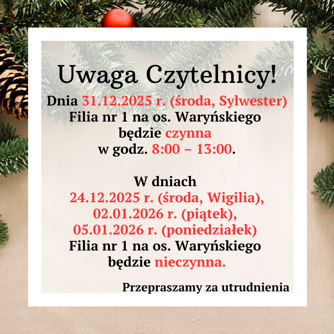 Informujemy o świątecznych zmianach w funkcjonowaniu filii nr 1.